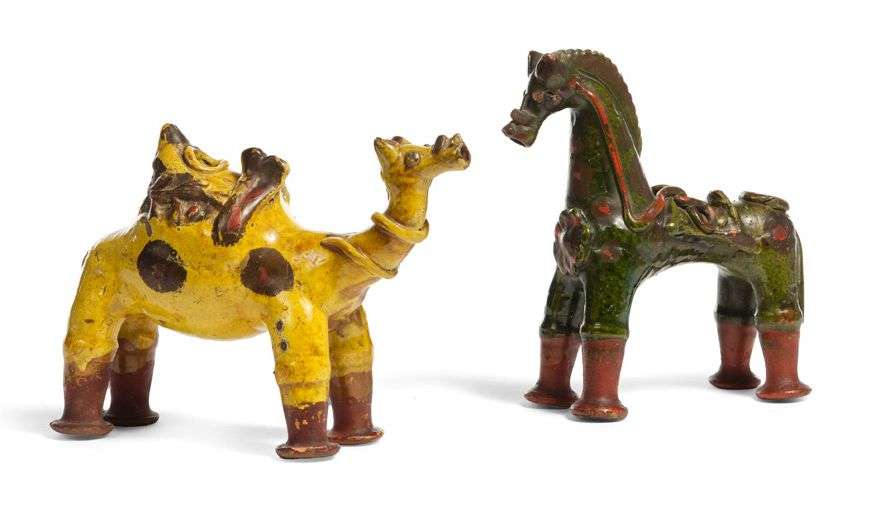On y joint un aquamanile en forme de cheval en terre cuite vernissée vert olive et rouge.