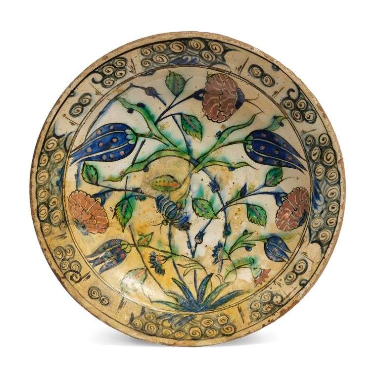 Plat «tabak» en céramique siliceuse, décoré en polychromie de bouquets de fleurs, tulipes et oeillets. Décor de nuages stylisés sur la bordure.