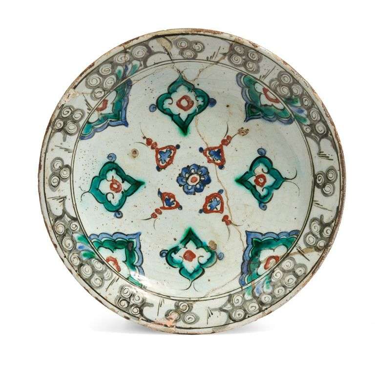 Plat «tabak» en céramique siliceuse, décoré en polychromie sur fond blanc de quatre mandorles chantournées vertes à coeurs rouges. Décor de vagues et rochers sur le marli. Alternance de rochers et nuages stylisés au dessous.