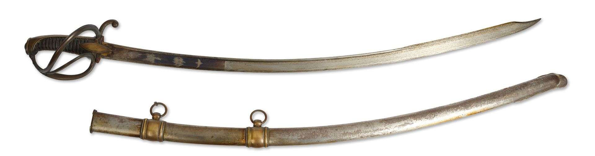 SABRE D'OFFICIER DE CAVALERIE LÉGÈRE, MODÈLE AN IX Monture en bronze décorée au trait type à la chasseur. Calotte ovale décoré au trait et assemblée dans la garde. Arc de jointure plat décoré au trait duquel se détache deux branches de garde. Quillon courbe en forme de goutte. Croisière en navette. Fusée en bois recouverte de cuir avec double filigrane alterné. Luxueuse lame courbe à jonc, large contre-tranchant et pointe en langue de carpe. Elle est gravée et bleuie au tiers, présence d'une cravate en tissu.