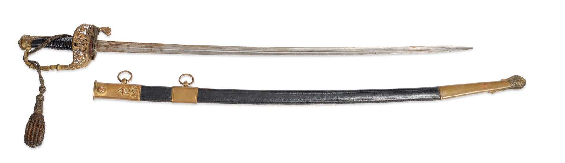 SABRE D'OFFICIER DE MARINE Modèle 1837. Monture en bronze doré et corne type réglementaire. Calotte ovale à décors de rocaille et à frise de coquilles Saint Jacques. Arc de jointure à décors d'enroulement et feuilles acanthe.