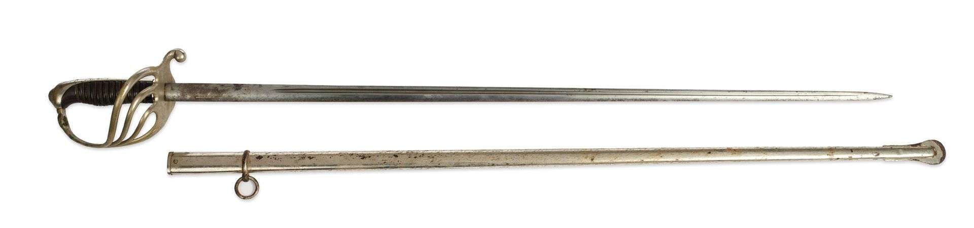 SABRE D'OFFICIER D'INFANTERIE Modèle 1882. Monture en maillechort type réglementaire. Calotte ovale assemblée dans la garde. Arc de jointure plat percé pour passage de la dragonne duquel se détache trois branches de garde.