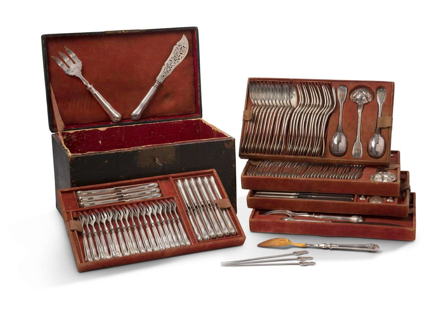 IMPORTANTE MÉNAGÈRE en argent modèle filets dont presque toutes les pièces sont aux grandes armoiries de la famille Roques de Beaumont sous une couronne comtale, en relief. Coffret à six plateaux comprenant notamment douze couverts de tables, dix-sept couverts à dessert avec les couteaux, 18 fourchettes à huitres et divers nombreux autres couverts de service. Dans sa boîte d'origine, couverte de cuir noire.Maîtres orfèvres : Hippolyte Thomas (insculpation en 1845) et Charles Cordonnier (insculpte en 1858).Poinçon Minerve. Et divers couverts en argent russe (poinçonnés)