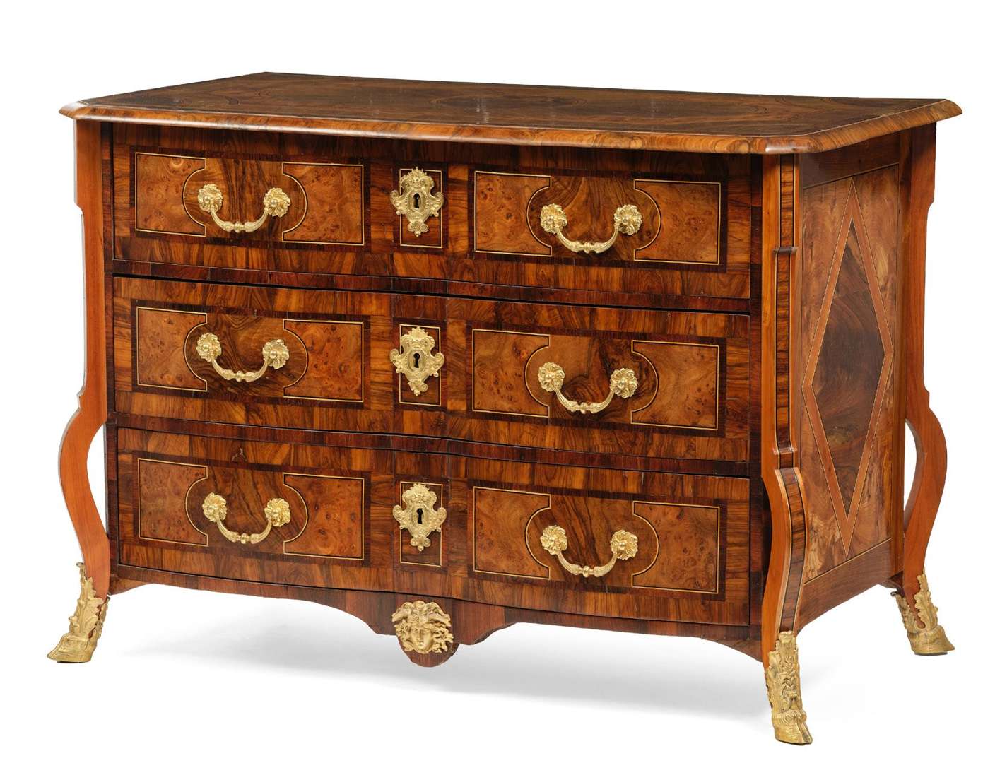 Elle repose sur des montants à jambage et pieds cambrés, belle ornementation de bronzes dorés tels entrées de serrure, poignées, tête de Gogone et sabots de biche.