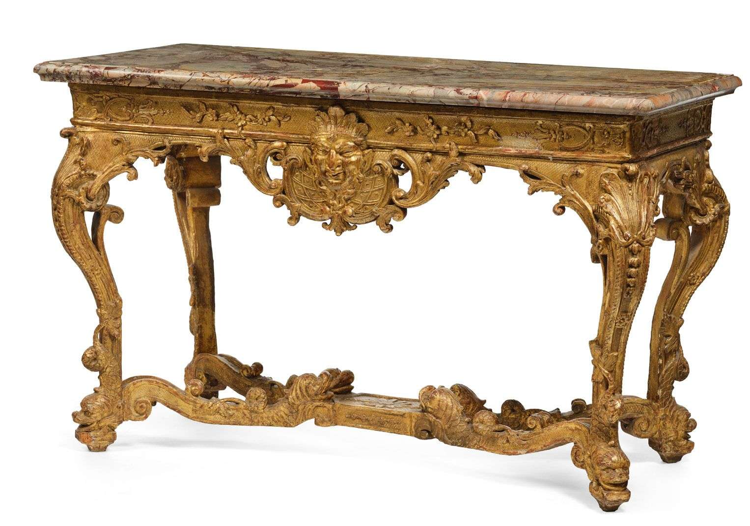 TABLE À GIBIER en bois richement sculpté et doré à décor de mascarons, enroulements et rinceaux fleuris sur fond de quadrillages, les pieds cambrés terminés par des têtes de dauphins et réunis par une entretoise en X formée de quatre dauphins.
