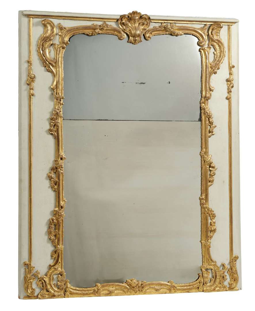 MIROIR DE TRUMEAU en bois sculpté et doré de chantournements rocailles et guirlandes de fleurettes sur un fond de bois peint ivoire.