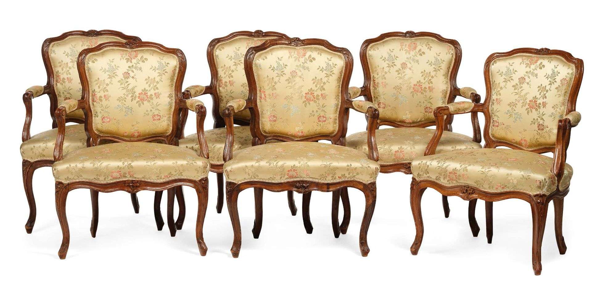 Suite de cinq fauteuils à dossier cabriolet en bois sculpté et mouluré.