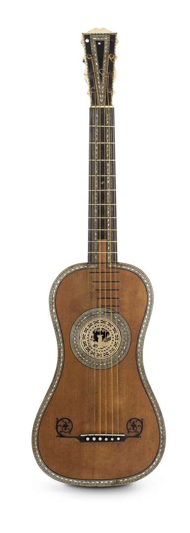 UNE GUITARE DE TRIANON Rare guitare dite en bâteau, la caisse en bois fruitier orné de filets d'ivoires et ébène, la table en épicéa d'un beau grain serré, pistagnes parisiennes et remarquable rosace en ivoire ajouré représentant deux colombes s'embrassant sur un temple de l'Amour.