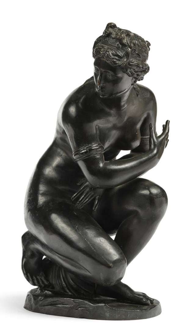 VÉNUS ACCROUPIE sur une coquille. Bronze à patine brune