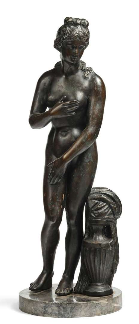 VÉNUS MÉDICIS Groupe en bronze à patine brune, debout contre un vase couvert d'un drapé. Travail dit «du Grand Tour», Italie, début du XIXe siècle.