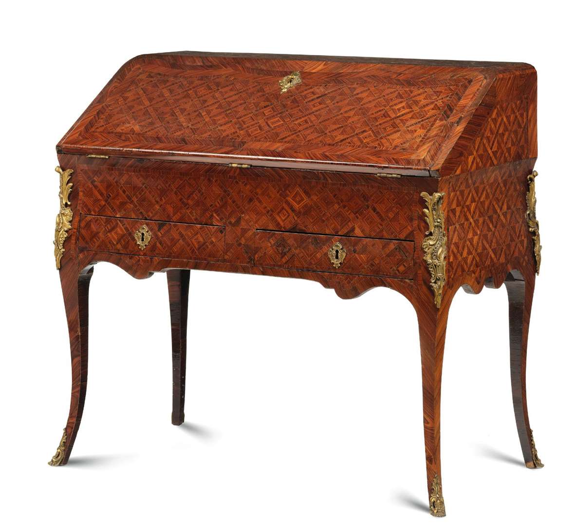Bureau de pente en marqueterie de réserves en carrés sur pointes de bois de rose, il ouvre à deux tiroirs en ceinture et un abattan dévoilant cinq tiroirs et un casier glissant à un tiroir.