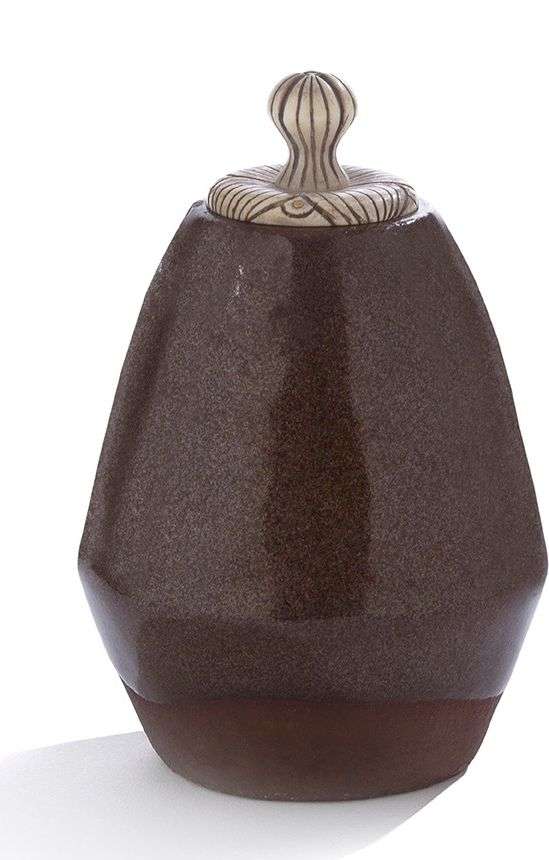 Vase couvert piriforme en grès émaillé brun métallisé à légères nuances noires.