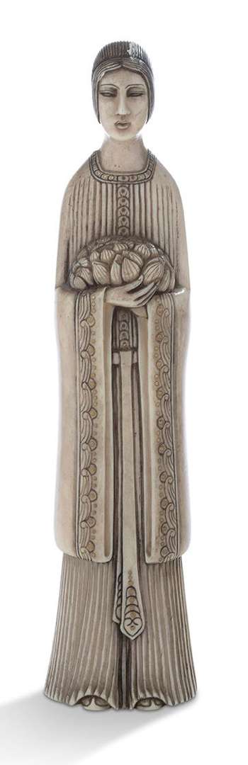Sculpture en ivoire rehaussée de petits clous dorés. Signée du cachet monogramme au revers de la base.