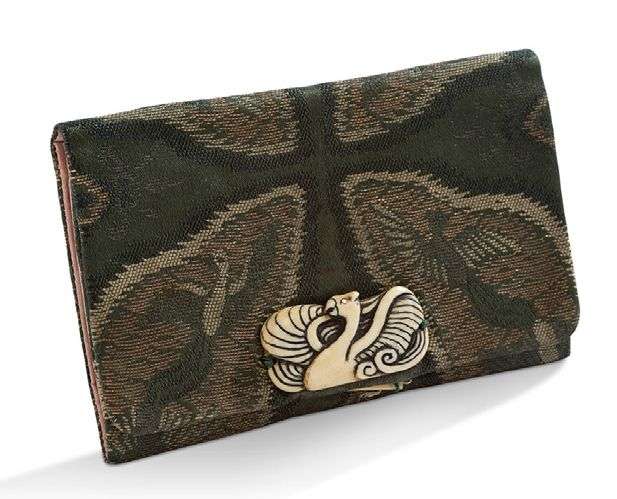 Blague à tabac en tissu vert à décor de phoenix dans les nuées, le fermoir en ivoire sculpté par Eugénie O'KIN, représentant un phoenix.