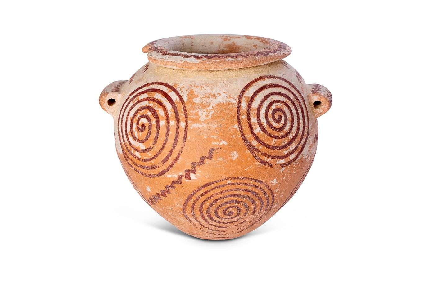 Vase à panse piriforme et à lèvre éversée, muni de deux anses tubulaires, peint d’un motif de spirales et de vaguelettes.