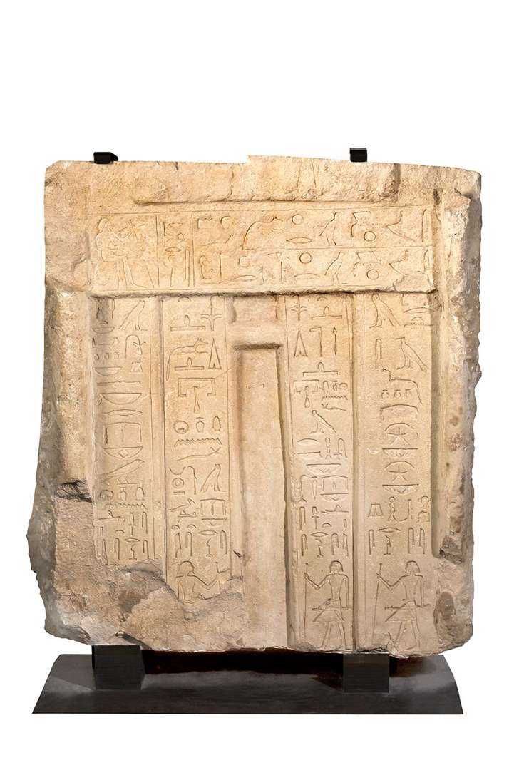 Stèle fausse porte à double dénivellation et à tore cylindrique gravée sur le linteau d’une scène représentant un dignitaire assis devant deux lignes et une colonne d’inscription en caractères hiéroglyphiques. Les doubles montants sont également gravés de textes en caractères hiéroglyphiques et sont ornés en bas de représentations du propriétaire debout tenant une longue canne. Dépôt calcaire et coloration grise en profondeur. Lacunes visibles, sinon très belle conservation. Égypte, fin de l’Ancien Empire. PROVENANCE Vente Piasa (cabinet Mariaud de Serres), 17 mars 2003 (n° 247)
