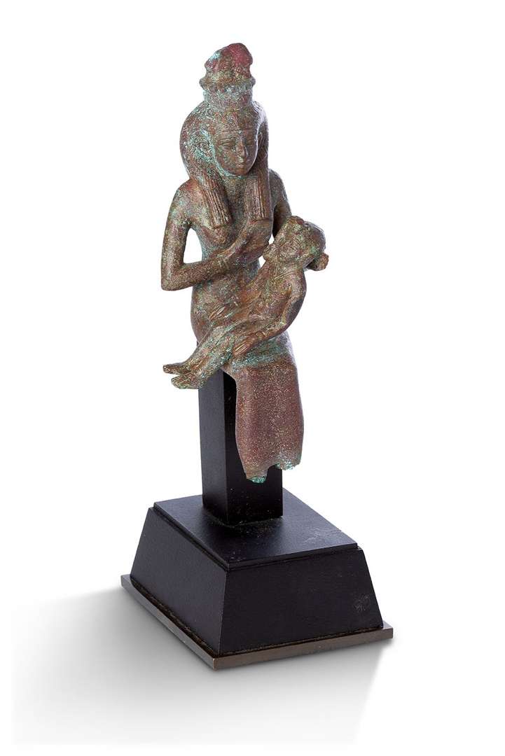 Isis est assise, allaitant l’enfant Horus nu, assis sur ses genoux. Elle est coiffée d’une lourde perruque comportant la dépouille de vautour et Horus est coiffé de la mèche de l’enfance. Bronze. Oxydation rouge et verte et dépôt calcaire. Lacunes visibles (pieds et couronne). Égypte, XXVIe-XXXe dynasties. Haut. : 15 cm