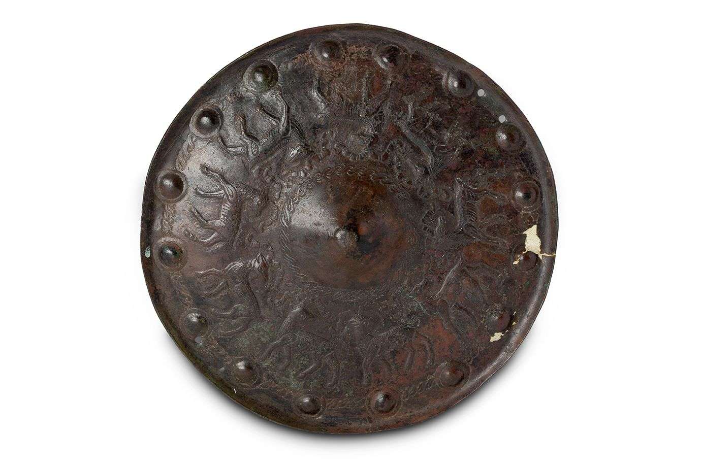 Il est orné en repoussé et en gravure d’une frise composée de neuf capridés la tête tournée vers l’arrière. Bronze. Oxydation brune et dépôt calcaire. Cassures et petites lacunes visibles. Ourartou ou Iran, VIIIe-VIIe s. av. J.C. Diam. : 22 cm. PROVENANCE Collection de M. Weil.