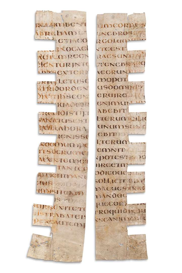 Comme beaucoup des témoins les plus anciens de la Vulgate, notre fragment respecte la mise en page que Jérôme avait choisi « per cola et commata », comme il l'explique dans son prologue au livre d'Ézéchiel « Legite igitur et hunc iuxta translationem nostram quia, per cola scriptus et commata, manifestiorem legentibus sensum tribuit » : «Par conséquent, lis ce texte selon notre traduction parce que, comme l’écriture est pure et césurée, cela donne un sens plus clair aux lecteurs » | soit matériellement une découpe délibérée dans la phrase avec un saut de ligne marqué pour souligner le sens du texte. Nos fragments proviennent probablement d’un manuscrit sur deux colonnes, estimé à plus de 200 feuillets d’environ 252 x 240 mm. Les fragments se suivent presque car seulement un feuillet les séparait. PROVENANCE La reliure où été conservé le manuscrit est un simple velin avec des plats de carton. Il est probable que le fragment a été découpé et séparé du manuscrit par un relieur dans les environs de Francfort entre 1595 et 1614-15, quand Lord Herbert voyageait en Allemagne. La présence du manuscrit sur le sol allemand pourrait s’expliquer de maintes façons, mais l’hypothèse la plus probable serait au moment de la visite des premiers missionnaires chrétiens irlandais et anglais à la fin du VI e et au VII e siècle. Les