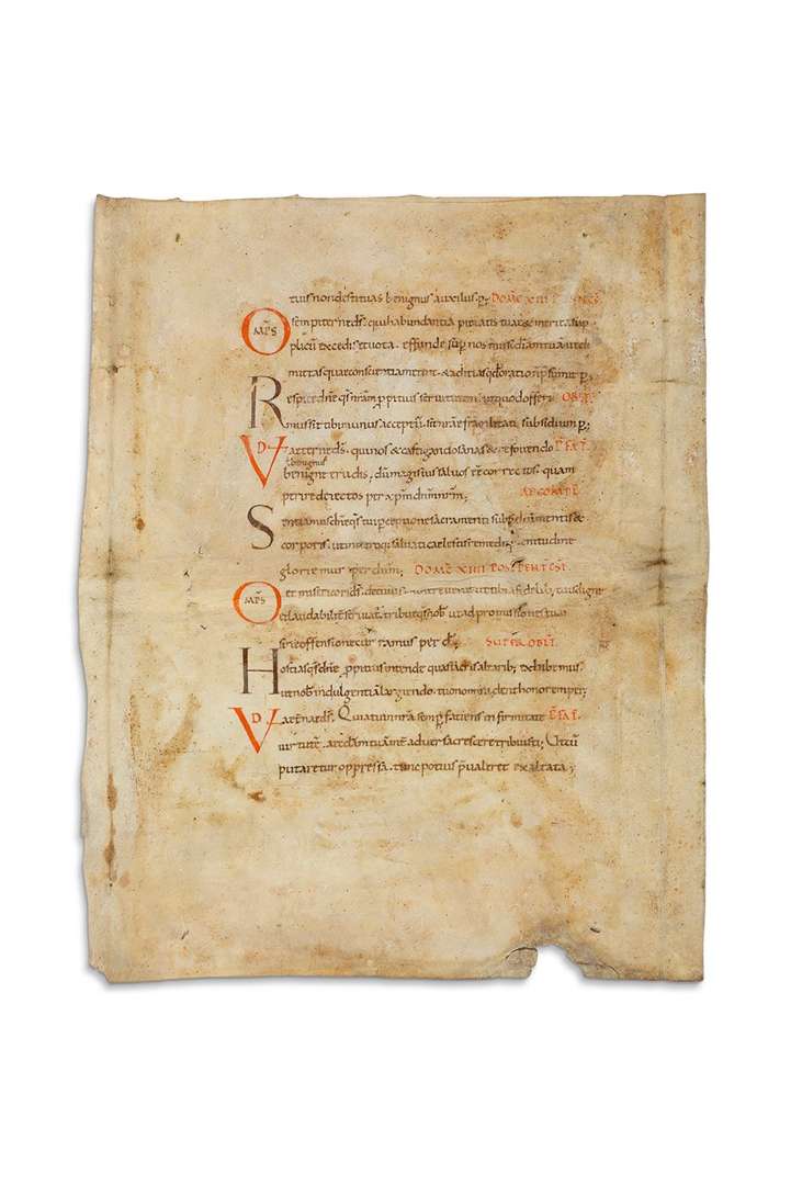 Grand feuillet manuscrit sur parchemin (360 x 290 mm), écrit en latin, recto et verso sur 20 longues lignes par page, initiales rouges et noires alternées, rubriques en écriture onciale et texte en minuscule caroline. Réemploi de reliure. Remarquable manuscrit liturgique de la période carolingienne datable de la seconde moitié du IXe siècle. TEXTE Ce feuillet produit par un scriptorium monastique, regroupe les collectes et autres oraisons de la messe : secrète ou prières sur les oblats (ici « SUPER OBLT), le passage de la préface spécifique à chaque dimanche (ici «PFAT ») et l’antienne de communion (ici «AD CO »). Les collectaires étaient les livres du célébrant de l’office religieux, contenant les textes qu'il lui appartient de prononcer durant la messe. Ce recueil contient les lectures courtes des leçons dites durant les différentes heures de l’office (les capitules) et les prières qui clôturaient les heures (les collectes). Elles pouvaient varier selon les fêtes et c’est donc ce que nous voyons dans ce feuillet où chaque fête possède une oraison propre. Ce manuscrit est un précieux témoin des pratiques religieuses et des prières dites dans les monastères carolingiens. BIBLIOGRAPHIE P.-M. Gy, « Collectaire, rituel et processionnal », dans la Revue des sciences philologiques et théologiques, vol. 44 n°3, juillet 1960. - J.-B. Lebigue, Initiation aux manuscrits liturgiques, IRHT, 2007. - B. Bischoff, La nomenclature des écritures livresques du IXe au XVIe siècle, CNRS, 1954.