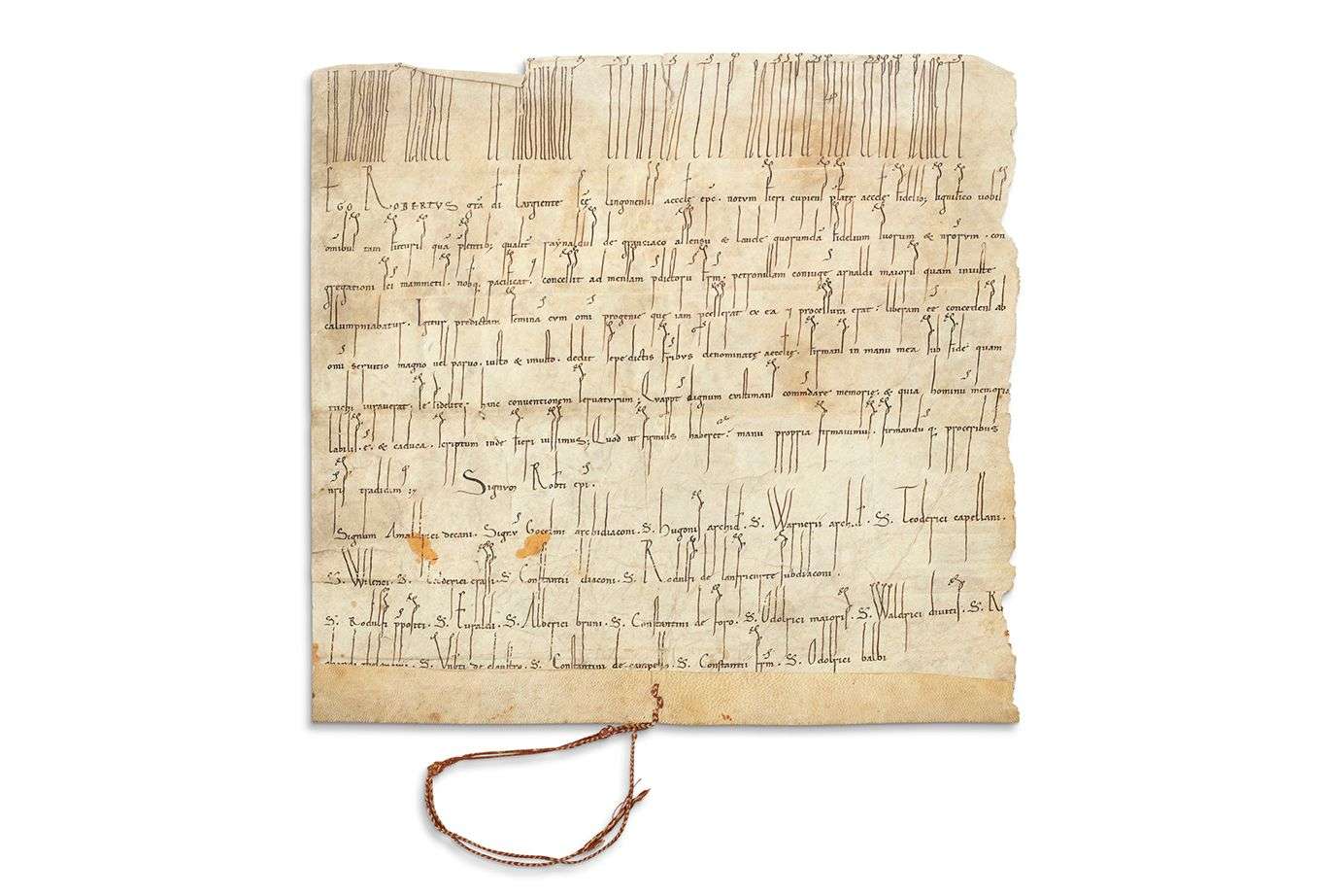 Un feuillet sur parchemin, 320 x 325 mm | 13 longues lignes | encre carbone | écriture caroline | petites taches, bord droit légèrement rogné (sans perte de texte), deux déchirures (sans manque) en haut. Annotations d’époque et postérieures au dos. Grande cordelette tressée (30 cm) ayant servi à l’attache du sceau (aujourd’hui manquant). Rarissime et belle charte de Robert de Bourgogne (Châtillon-sur-Seine 1059 / 1110), évêque de Langres de 1085 à 1110, avec sa grande tresse, relative à la servitude d’une femme. TEXTE Accusée de quelque forfait par le connétable de Bourgogne, Renaud de Grancey (né vers 1060), Pétronille, femme d’Arnauld le Vieux, trouve en l’évêque Robert de Bourgogne, un défenseur. Les deux hommes trouvent un accord (placatus) suivant lequel Pétronille est « remise en liberté » sans condition ni condamnation par Renaud et donnée au chapitre de l’église cathédrale de Saint-Mammès. De condition servile, elle le demeure au terme de cet acte qui est en quelque sorte un acte d’affranchissement (liberam concedens).