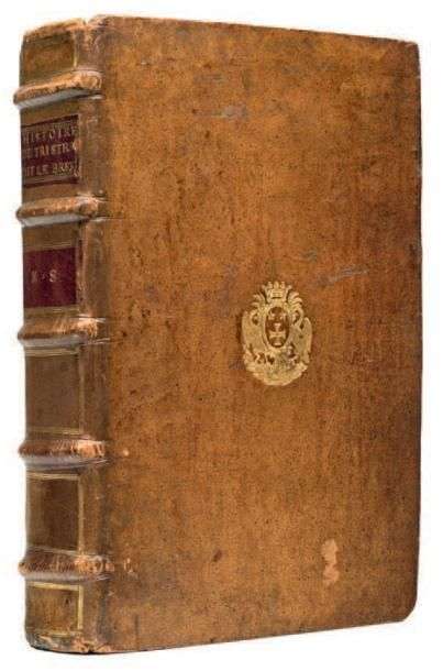 Reliure de plein veau havane glacé et moucheté (XVIIIe s.) sur ais de bois (éléments de la reliure d'origine), dos à 5 nerfs, triple filets dans les entre-nerfs, pièces de titre de cuir rouge avec en lettres dorées: «Histoire de Tristra (sic) dit le Bref (sic)