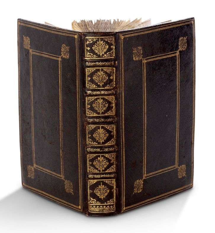 145 ff., 1f. bl. libre de papier, au moins un cahier manquant entre le f.34 et le f. 35 : i2, ii-viii8, ix9 [10-1, dont le dixième cahier manquant], x-xii8, xiii2, xiv-xvi8, xvii2, xviii8, xix6, xx2, xxi2 | 183 x 122 mm. (117 x 69 mm.) | sur parchemin | 24 longues lignes à l’encre carbone | réglures à l’encre rouge | quelques réclames, numérotation des cahiers dans la marge intérieure (parfois cachés dans la couture des cahiers) | textualis formata | rubriques, bouts de ligne à l’encre bleue et rouge, initiales cadelées à l’encre noire d’une ligne souligné d’encre jaune ou sur trois lignes avec encadrement à l’encre jaune parfois grotesque (profil d’homme), portée de quatre lignes à l’encre rouge à notation neumatique carrée, initiales filigranées à l’encre bleue ou dorée, grandes initiales peintes bleues ou rouges sur fonds d’or sur une à quatre lignes, quelquesunes à antennes terminées de feuilles de vigne dorées ou bleues, jusqu’à parfois former un superbes encadrement de feuilles de vigne et écus dorés (f.3 et 34v), une initiale historiée « D » introduisant l’office des mort au f. 3r (Job sur un tas de fumier moqué par sa femme et un de ses fils, 38 x 41 mm.), oiseau (épervier) dans l’encadrement en marge extérieure et armes peintes en marge inférieure du même feuillet. Plein maroquin noir du XVIIe ou XVIIIe siècle, dos à cinq nerfs avec décor aux entrenerfs, plats ornés d’un motif central à la « Du Seuil » avec trois filets d’encadrement, roullette dorée sur les coupes, tranches dorées, gardes de papier marbré, mors et coins légèrement frottés, un trou de vers au plat supérieur | Bel état (190 x 130 mm). Manuscrit liturgique probablement destiné à une sœur dominicaine de l’abbaye de Poissy et appartenant selon les armes en f. 3, à la famille des Sautereau, seigneurs de Moirans, famille noble du diocèse de Grenoble qui a participé la Guerre de Cent Ans (bataille de Verneuil, 1424) et aux Guerres d’Italie (bataille de Fornoue, 1495). Cet élégant processionnal de poche a été copié à l’usage de l’abbaye royale de Poissy au XVe siècle (aujourd’hui dénommé Prieuré SaintLouis de Poissy), fondée par Phillipe IV en 1304 en l’honneur de son grand-père Saint Louis | il confia ensuite les lieux à des Dominicaines. Les liens avec la famille royale durèrent des siècles et l’abbaye fût même choisie en 1561 pour une tentative infructueuse de réconciliation entre les catholiques et protestants dénommée aujourd’hui le « Colloque de Poissy » (voir S. Moreau-Rendu, 1968). La bibliographie sur les manuscrits provenant de l’abbaye répertorie aujourd’hui 31 processionnaux. Joan Naughton, dans son étude en avait premièrement identifié vingtsept et l’on en connaît maintenant trenteet-un. Notre manuscrit n’y est pas répertorié. Le volume contient l’office des morts à l’usage des dominicains et un processionnal avec un ensemble d’oraisons dédiées à l’usage dominicains (plusieurs processions pour Saint Dominique et pour la Fête-Dieu) et d’autres à l’usage de l’abbaye (Saint Louis (à qui l’abbaye était dédiée) et les deux dernières processions étaient propres à Poissy. On retrouve aussi une procession dédiée à la purification de autels de l’abbaye (ff. 48v-49). Bien qu’un nombres important de rubriques aient des formes masculines, plusieurs autres rubriques et chants se réfèrent aux « sorores » de l’abbaye (voir f.97 : In professione sororum). TEXTE − ff. 1-2v, Ajout postérieur de la fin du XVIIe (période de la reliure?), portées avec notation neumatique carrée de réponds, versicules et antiennes. − ff. 3-34, Office des morts à l’usage des Dominicains (voir Knud Ottosen, The Responsories and Versicles of the Latin Office of the Dead [Aarhus, 1993] 108-109, et 239-242), portées avec notation neumatique carrée de réponds, versicules et antiennes. − ff. 34v-35, Psaumes pénitentiels [fin manquante], rubr., Secuntur septem psalmi penitentiales − ff. 35-97v, Processionnal avec notations musicales [début manquant], rubr., Postea aspergatur aqua benedicta, suivit de rubr., In processione antiennea, avec la Bénédiction des cendres (f. 39v)| Dimanche des rameaux (f. 42v)| rubr., Feria quinta in cena domini... due sorores ante gradus altare... (f. 48)| rubr., Ordo altarium abluendorum (f. 49)| Dominique et Pierre (f. 59), Louis (f. 49v, f. 90)| Jean Baptiste (f. 60v)| Corpus Christi (f. 81v)| Nativité de Saint Jean Baptiste (f. 83v) Dominique (f. 85v)| Nativité de Marie (f. 92) | f. 94, rubr., In solenni receptione conventus dicatur de beata virgine... | f. 94v, rubr., In receptione legatorum et prelatorum| f. 95v, rubr., In receptione secularium principium| f. 97, rubr., In profession