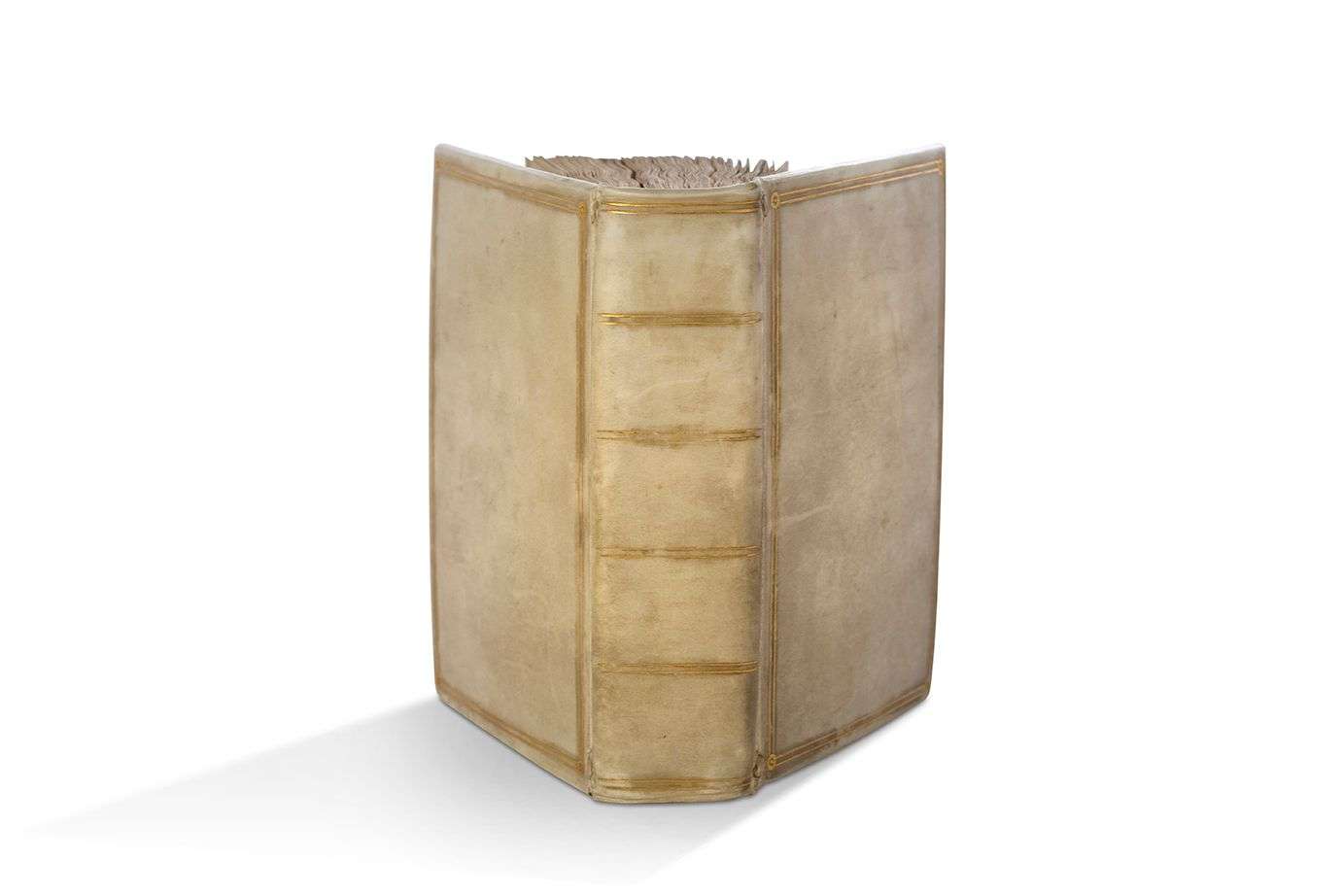 Plein vélin au XIXe siècle, dos long avec double filet doré à l’emplacement des nerfs, double-filet sur les plats, tranches dorées, conservé dans un étui de toile blanche fabriqué pour le Major Abbey. (110 x 76 mm)