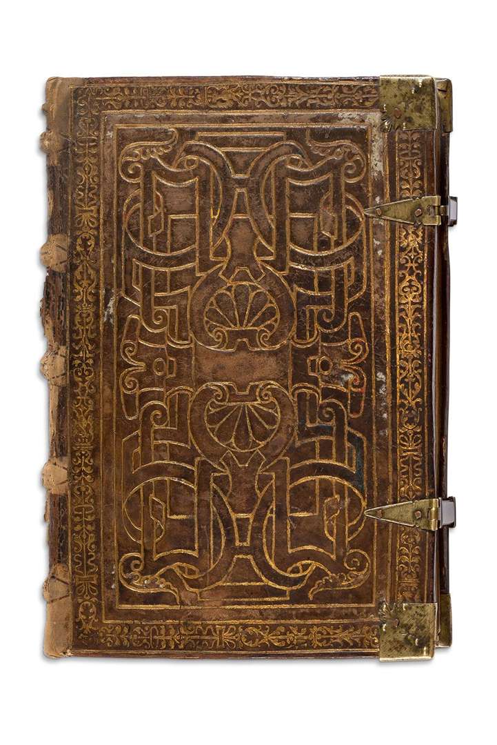 DESCRIPTION MATÉRIELLE 108 ff. | 184 x 125 mm (113 x 80 mm) | sur parchemin | 20 longues lignes à l’encre carbone | réglures à l’encre jaune pâle | textualis formata | 14 miniatures pleine page, 22 vignettes enluminés (Péricopes, Obsecro te, O intemerata et suffrages), initiales champies peintes dorées à la feuille avec entrelacs de fleurs trilobées en leur centre (sur six lignes), initiales champies dorées à la feuille (sur deux lignes) parfois avec antennes filigranées et fleuries, initiales dorées ou filigranées dans le texte, encadrements sur fonds criblé doré avec feuilles d’acanthe bleues et oranges et petite végétation simple aux couleurs vives, bouts de lignes à l’encre rouge et bleue avec un écu doré au milieu (litanies), rubriques. Plein veau à entrelacs Renaissance avec reste de cires colorées (XVIe s.), dos à 5 nerfs avec caissons ornés à double filets d’encadrement, plats à riche décors d’entrelacs et encadrements de filets et roulette, reste de cire colorée blanche, bleue et rouge, coins renforcés par des pièces de laiton d’époque et fermoirs partiellement d’époque (attache XIXe), roulette sur le coupes, tranches dorées | restaurations au dos (coiffes et nerfs) qui faiblissent au mors du plat supérieur, Superbe livre d’heures à l’usage d’Utrecht produit dans les ateliers flamands au troisième quart du XVe siècle. TEXTE Liste des textes, tous en latin : − ff. 1r-6v : Calendrier à l’usage de Rome/Utrecht(?) : Variantes : 19 mars : Landoaldi pbri, 31 mars : Valerie v., 17 avril : Rufi mr., 7 mai : Gaudencii mr ( Godehardus ?), 14 mai : Corone Virginis, 21 mai : Valentis mr., 5 juillet: Donati mr. , 12 juillet: cleti pp., 5 sept. : Saturnini mr (rien à cette date dans CoKL), 12 sept. : Ypoliti, 12 oct. : Marvelli mr., 20 oct. : Asterius mr., 6 nov. : Winnoci abb.. − ff. 7r-9v : Péricopes évangéliques − ff. 11r-14v : Heures de la Croix − ff. 15r-18 : Heures du Saint Esprit − ff. 18r-20: Missa Beate Marie − ff. 21-23 : Obsecro te et O Intemerata − ff.24-31: Suffrages (Sainte Trinité, Saint Jean-Baptiste, Saint Pierre, Saint Paul, Saint Jean, Saint André, Saint Laurent, Saint Jacob, Saint Martin, Saint Nicolas, Sainte Catherine, Sainte Agathe, Sainte Barbara, Sainte Marguerite, Sainte Marie-Madeleine, Sainte Anne) − ff. 33r-69v : Heures de la Vierge à l’usage de Rome : 33r: Matines – 43r: Laudes – 50r: Prime (antienne «Assumpta es », capitule « Que est ista » ) – f.53r: Tierce – f.56r: Sexte - f.59r: None (antienne «Pulchra es » et capitule « In plateis sicut ») – f.62r: Vêpres – 67r: Complies. − ff. 71r-74v : Officium beate Marie quod dicitur per totum adventum − ff. 76r-81: Psaumes pénitentiels − ff. 82-85v : Litanie et pétitions − ff. 87r-108v : Office des morts à l’usage de Rome (suivant le relevé de Knud Ottosen, ordre des réponds : 14, 72, 24, 46, 32, 57, 68, 28, 40).