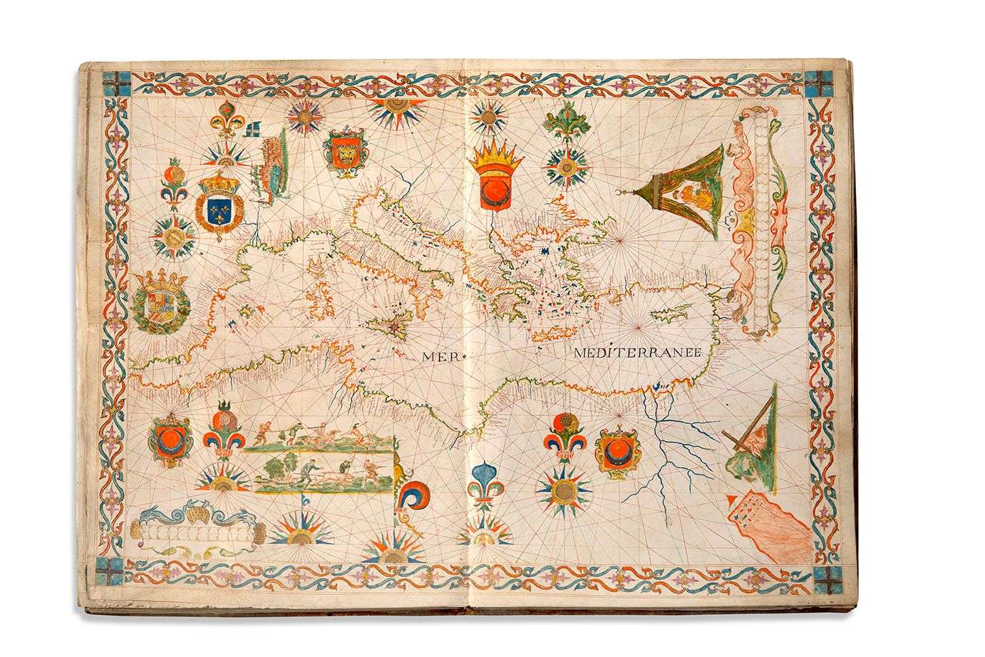 L’atlas a été réalisé en 1648 par un carto - graphe marseillais inconnu avant l’apparition du volume, Honoré Boyer. Absent de tous les répertoires spécialisés, il paraît avoir été un cartographe amateur, puisant notamment ses sources dans les atlas espagnols, portugais et italiens pour les grandes cartes nautiques d’Eu - rope, de Méditerranée et d’Amérique comme le montrent les toponymes utilisés. Marseille était au XVII e siècle l’un des centres importants de production de cartes marines. On retrouve une famille Boyer de Fonscolombe, marchands de tissus présents près de Toulon au XVI e et à Aix à la même époque. Ces luxueuses cartes marines indiquent aux navigateurs les différents ports, les fleuves navigables, le relief des côtes avec ici les pays qui les administrent. Notre manuscrit contient les cartes pour l’archipel grec, la Méditerranée, la côte ouest européenne et la partie nord de l’Afrique de l’Ouest, les caraïbes et les côtes américaines, l’île d’Elbe, la Sicile, Malte, et une mappemonde. Elles sont ornées des blasons des pays, roses des vents fleurdelisées, navires, monstres marins, curiosités, monuments, ban - deaux et encadrement. Cette richesse d’orne - mentation indique que notre volume faisait partie des ouvrages de luxe, réalisés pour de riches clients et devaient probablement être consultables sur la terre ferme, en bibliothèque et conservés dans des collections sur terre ferme. Ces instruments, dont la production durera jusqu’au XVIII e siècle, ne seront détrôn és que par l’apparition des grands atlas nautiques imprimés aux Pays-Bas.