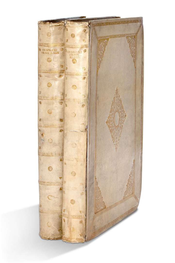 Vélin rigide à rabats de l’époque, dos lisse orné, double encadrement de filets et roulette dorée sur les plats, écoinçons dorés aux angles internes, grand ornement losangé central, tranches dorées (reliure hollandaise). (Coins un peu émoussés, liens absents. Vol. I : première charnière fendue et fente horizontale au dos à mi-hauteur avec soulèvement du vélin, extension dépliante de la planche «Bononia » roussie, déchirure marginale restaurée à la planche « Frascati », avec petite atteinte à la composition | vol. II : petit trou au dos, petites déchirures sans manques au centre des pliures de certaines planches d’obélisques.)