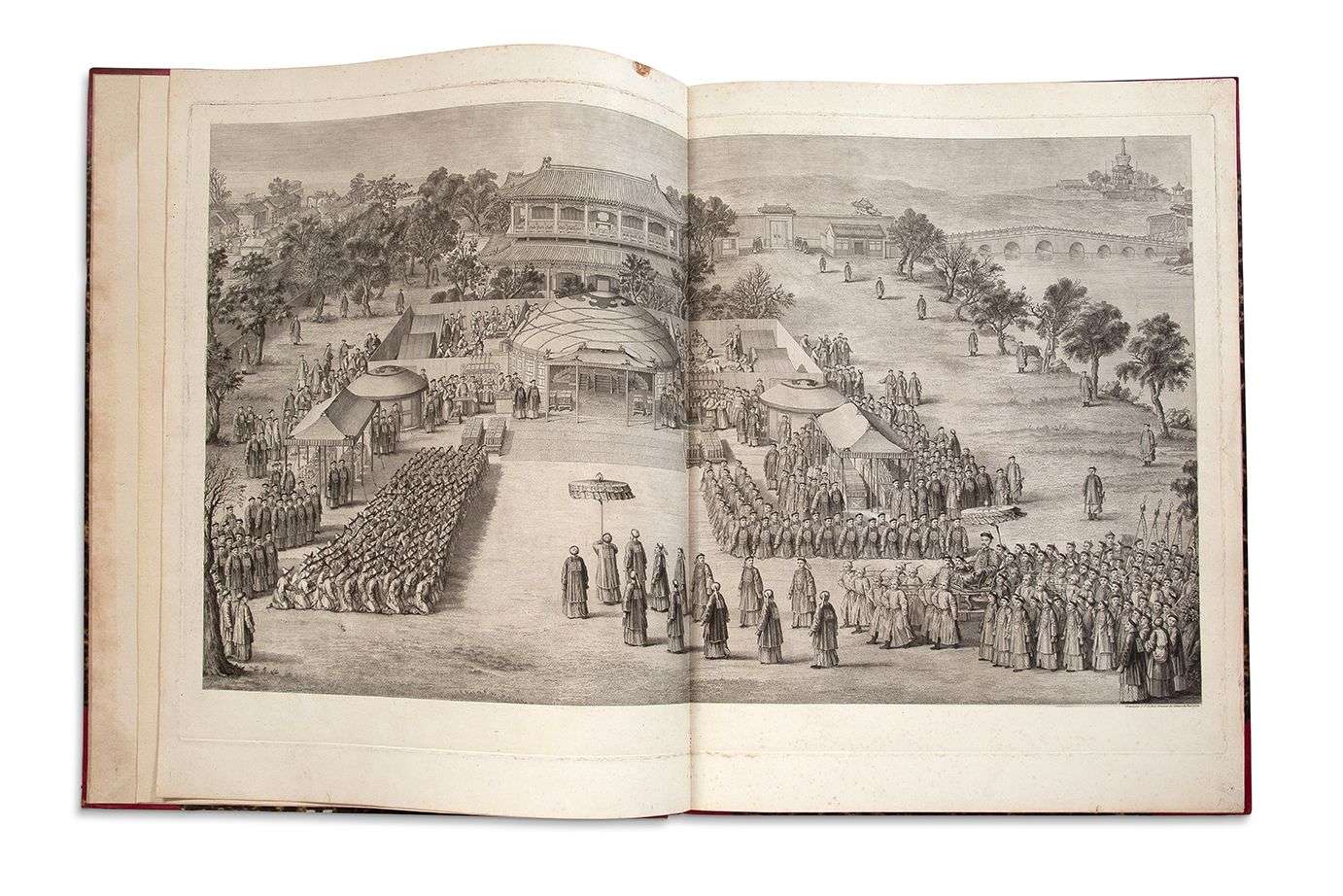 In-folio (668 x 488 mm), 16 planches sur page double montées sur onglets (12 d’entre elles datées entre 1769 et 1774). Dimensions des compositions hors marges : environ 510 x 890 mm. Demi-basane rouge à coins du XIXe siècle, dos lisse orné de filets dorés. (Reliure légèrement frottée, coins émoussés.) Spectaculaire suite complète, en premier tirage, des 16 estampes commandées à la France par l’empereur de Chine pour célébrer ses victoires militaires. À la suite de ses conquêtes en Haute-Asie menées de 1755 à 1759, l’empereur de Chine Qianlong voulut immortaliser ses faits d’armes en décorant le palais Zi Guang Ge de Pékin de 16 peintures illustrant ses propres poèmes relatant la campagne. Il confia le soin à quatre missionnaires établis à Pékin, les jésuites Giuseppe Castiglione, Ignatus Sichelbarth, Jean-Denis Attiret et Jean Damascène, d’en réaliser les esquisses préparatoires.