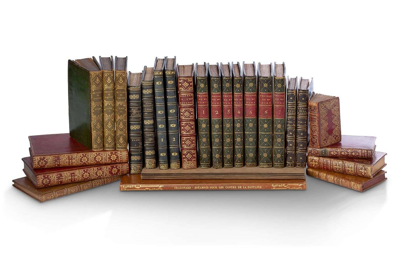 3 - HUME (David). Œuvres philosophiques. Traduites de l’anglais. Nouvelle édition... Londres [i.e. Paris], 1788. 7 volumes in-8, maroquin vert à grain long de l’époque, dos lisse orné, pièces de titre et de tomaison de maroquin rouge, triple filet doré autour des plats, coupes et bordures intérieures décorées, tranches dorées.