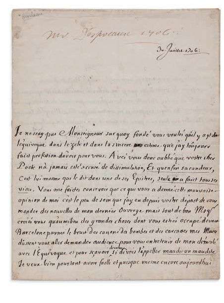 Superbe lettre sur sa Satire XII sur l'Équivoque, qui ne sera publiée qu'après sa mort, et sur la glorieuse conduite du duc au siège de Barcelone.