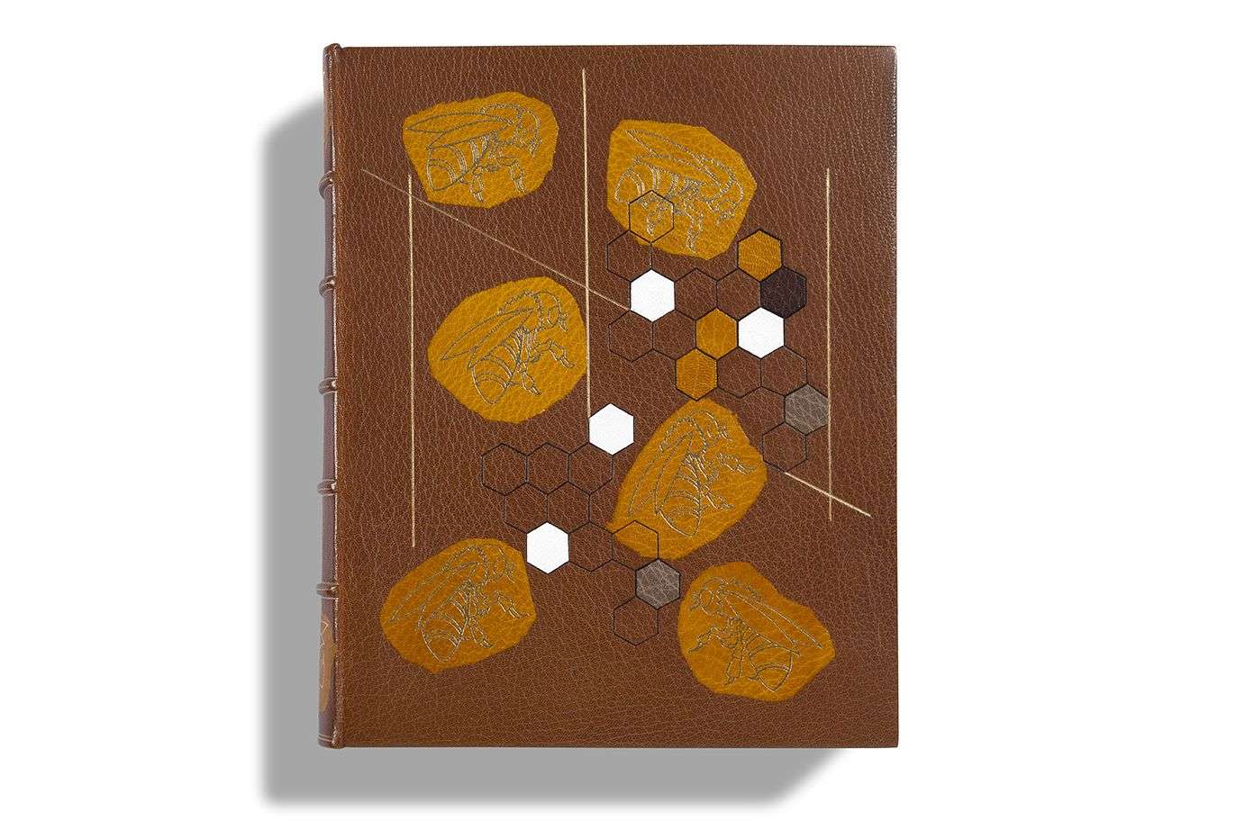 MANUSCRIT autographe, La Vie des abeilles, [1900-1901] | 326 feuillets (plus 3 titres) in-4 (environ 21 x 17 cm, certains découpés et recollés), couverture de papier orange, montés sur onglets entre des feuillets de papier vélin fort, le tout en un fort volume in-fol., reliure parlante maroquin havane à grand décor mosaïqué et doré sur les plats et le dos avec des pièces de maroquin jaune, blanc, brun représentant des abeilles et des alvéoles de ruche | doublures de maroquin citron avec croisillon de filets à froid, gardes de moire vert bronze, doubles gardes, tranches dorées, étui (Fryns).