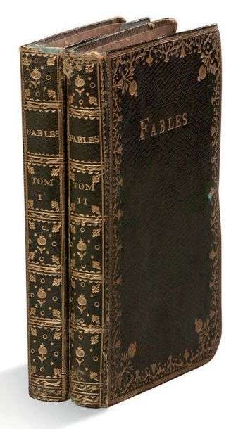MANUSCRIT en partie autographe de ses Fables| 455 pages montées sur cordelettes de soie verte et reliées à l'époque en deux volumes in-12 maroquin souple vert, petite dentelle dorée d'encadrement ornée de grenades dans les coins, titres dorés Fables sur les plats sup., dos lisses ornés, gardes de tabis rose.