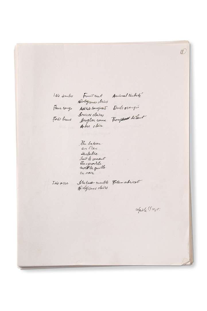 Le premier poème du recueil (« refait le 15 sept. » est-il noté sur le manuscrit) servira d’exemple : « Isis sombre Fruit vert Animal tacheté Néologismes clairs Fleur rouge Attitude transparente Étoile orangé Source claire Forêt brune Sanglier roux Troupeau bêlant Arbre clair Un bateau sur l’eau seulabre suit le courant Un crocodile mord la quille en vain Isis ocre Statue meuble Totem abricot Néologismes clairs » Ces poèmes à la structure inflexible n’ont rien d’exercices rhétoriques. Ils sont au contraire chargés d’éléments personnels et dessinent même une sorte d’autobiographie. On retrouve des allusions à sa femme Janine disparue, à son passage dans le surréalisme (« Songe creux / Songe pâle / Songerie blême / Singerie vide »), au bombardement du Havre (« Ville rasée / Ville pliée / Ville concassée / Ruines générales »), au Saint-Germain-des-Prés des années cinquante (« Vertiges vainqueurs / Alcools rocailleux / Comptoirs sirupeux / Échos noachites »). Un dossier de poèmes préparatoires ou écartés (14 ff. in-4 ou in-8, dont 6 sur papier de la nrf), à l’encre noire ou au stylo bleu, montre notamment que Queneau avait eu l’idée de composer des lipolepses à partir de poèmes célèbres de la littérature française, ou même de ses propres œuvres | ainsi pour Mallarmé : « Glaive nu / siècle épouvanté / voix étrange / Sursaut vil », ou pour Pierrot mon ami : « moyenne petite / temps beau / autos électriques / manèges déserts » | mais aussi Ronsard, du Bellay, Malherbe, Le Lac de Lamartine, Le Balcon de Baudelaire, Verlaine… II et III. Le manuscrit, à l’encre noire, est paginé de 1-58, sur de feuillets arrachés à des cahiers d’écoliers à grands carreaux (22 x 17 cm), sauf le premier feuillet de papier vélin (27 x 21 cm). Il présente des ratures et corrections (249 mots ou passages biffés, corrigés ou ajoutés), et des variantes. Tous les poèmes sont datés, et ont été rédigés du 6 avril au 19 mai 1975, à raison d’un ou deux par jour. Les deux derniers poèmes du manuscrit seront placés en tête de la IIIe partie.