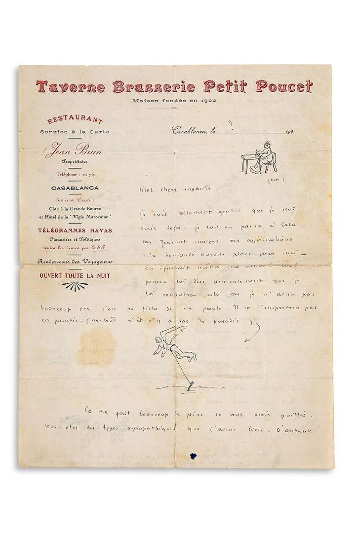 L.A.S. « Saintex », [Casablanca, vers 1925-1927 ?], à ses amis pilotes | 2 pages d’un feuillet in-4 (27,5 x 21,3 cm) à en-tête de la «Taverne Brasserie Petit Poucet à Casablanca, encre noire (quelques légères taches et petites déchirures marginales, fentes aux plis).