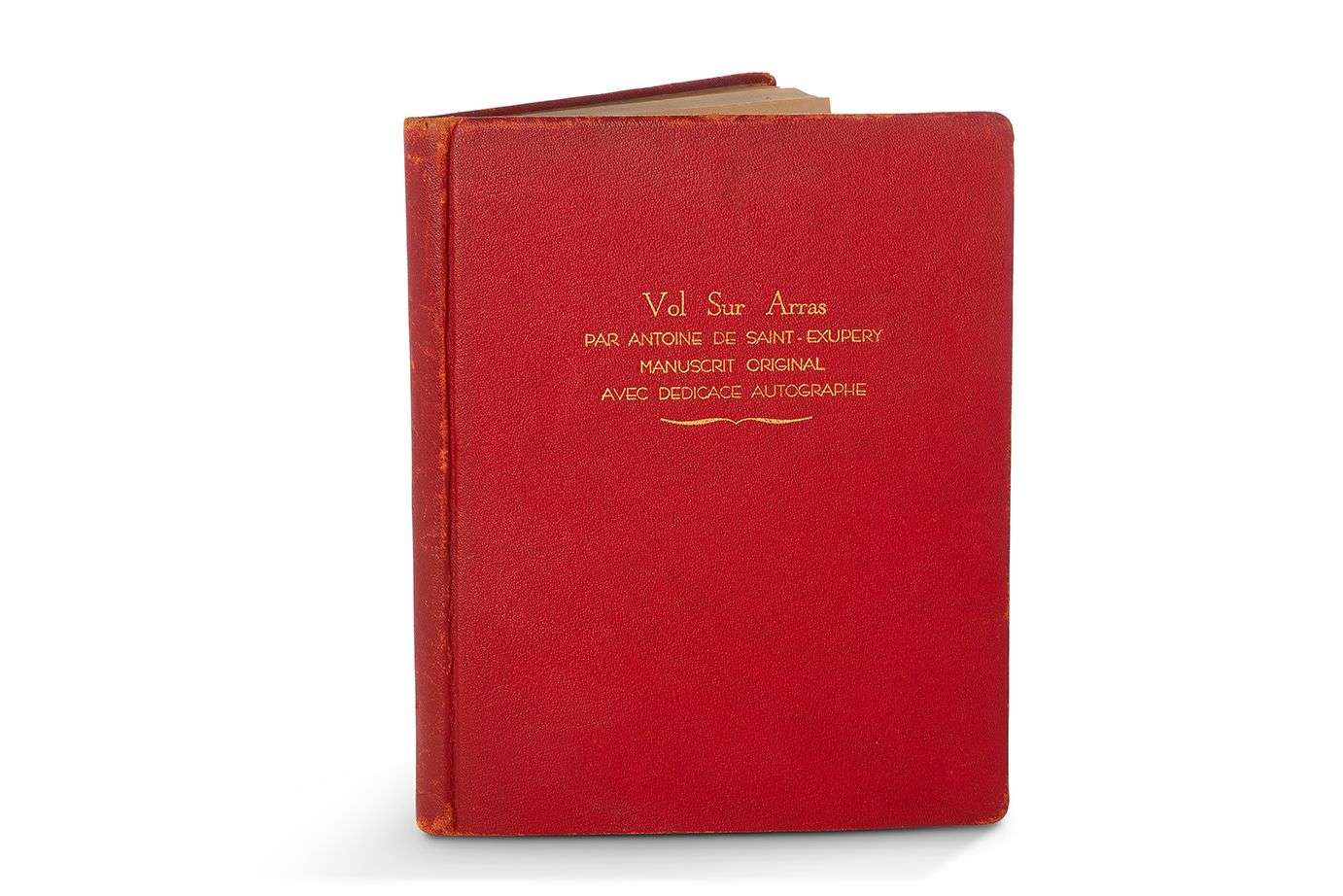 TAPUSCRIT original corrigé, Vol sur Arras [Pilote de guerre | fin 1941] | [2]-200 pages in-4 (27,4 x 21,6 cm), reliure bradel chagrin rouge, titre doré sur le plat sup. Vol Sur Arras / par Antoine de Saint Exupéry / manuscrit original /avec dédicace autographe (coins et dos frottés).