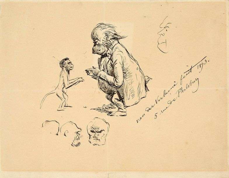 Couple de singes et autoportraits simiesques. Dessin original, avec mention manuscrite à droite : «Van der Verlaine fecit 1893. 5 rue de Phalsburg».