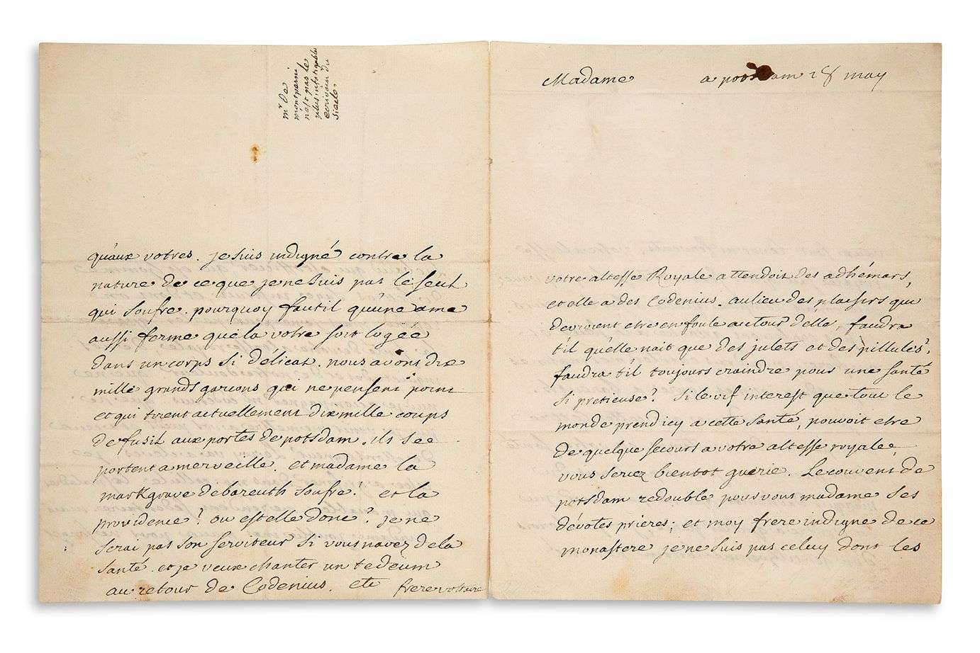 L.A.S. « frere Voltaire », Potsdam 28 mai [1751], à WILHELMINE de Prusse, Margrave de BAYREUTH | 4 pages in-4.