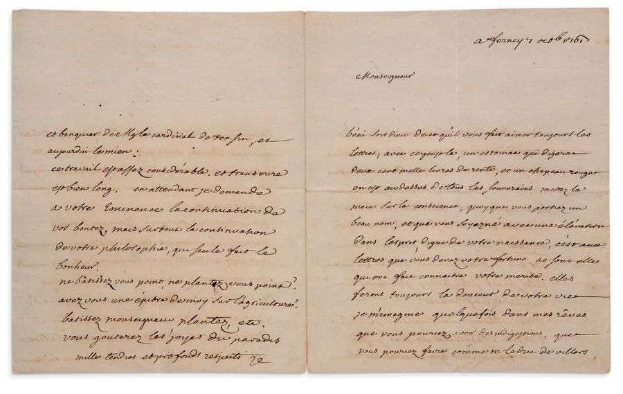 L.A.S. «V», Ferney 7 octobre 1761, au cardinal de BERNIS| 4 pages in-4.
