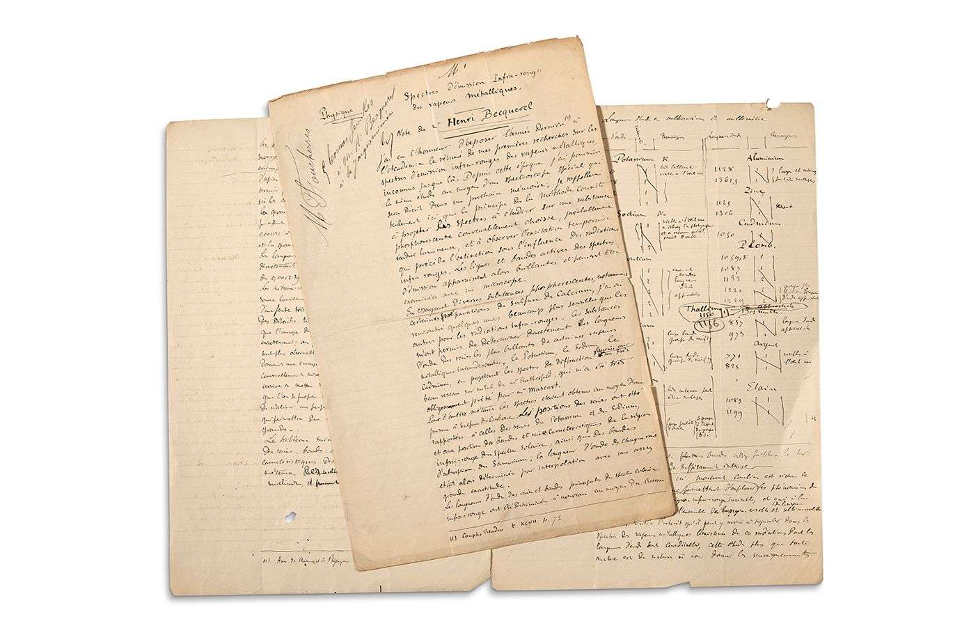 Manuscrit de travail de son étude sur les rayonnements infra-rouges des métaux . Brouillon et mise au net de l’étude publiée sous ce titre dans le volume 99 des Comptes-rendus de l’Académie des Sciences, 1884, p. 374-376. Rédigé à l’encre noire sur papier ligné, ils présentent de nombreuses ratures et corrections. Becquerel dit continuer ses « premières recherches sur les spectres d’émission infrarouge des vapeurs métalliques inconnus jusque-là […] au moyen d’un spectroscope spécial […] le principe de la méthode consiste à projeter les spectres à étudier sur une substance phosphorescente convenablement choisie, préalablement rendue lumineuse, et à observer l’excitation temporaire qui précède l’extinction sous l’influence des radiations infrarouges. Les lignes et bandes actives des spectres d’émission apparaissent alors brillantes et peuvent être examinées avec un microscope. En essayant diverses substances phosphorescentes, notamment certaines préparations de sulfure de calcium, j’en ai rencontré quelques-unes beaucoup plus sensibles que les autres pour les radiations infra-rouges. Ces substances m’ont permis de déterminer directement les longueurs d’onde des raies les plus brillantes de certaines vapeurs métalliques incandescentes, le Potassium, le Sodium, le Cadmium, en projetant les spectres de diffraction fournis par un très beau réseau sur métal de Mr Rutherford [….] Pour d’autres métaux les spectres étaient obtenus au moyen d’un prisme à sulfure de carbone. Les positions des raies ont été rapportées à celle des raies du Potassium et du Sodium, et aux positions des bandes et raies caractéristiques de la région infra-rouge du spectre solaire, ainsi que des bandes d’absorption du Samarium | la longueur d’onde de chaque raie était alors déterminée par interpolation avec une assez grande exactitude »… Etc. Un tableau donne et commente les « Longueurs d’ondes en millionièmes de millimètre » du potassium, du sodium, du strontium, du calcium, du magnésium, de l’aluminium, du zinc, du cadmium, du plomb, du bismuth, de l’argent, de l’étain… Et Becquerel conclut : « Outre l’intérêt qu’il peut y avoir à signaler dans les spectres de vapeurs métalliques l’existence de ces radiations, dont les longueurs d’onde sont considérables, cette étude, plus que toute autre, est de nature à nous donner les renseignements les plus précieux sur les lois encore inconnues qui régissent les mouvements vibratoires des vapeurs incandescentes ».