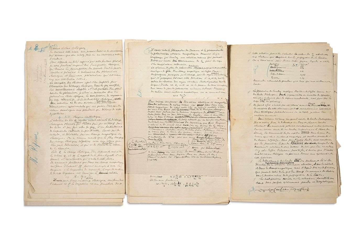 MANUSCRIT autographe, [Sur les électrons, 1907] | 14 pages et quart in-fol. (6 petites découpes) | sous emboîtage toilé noir.