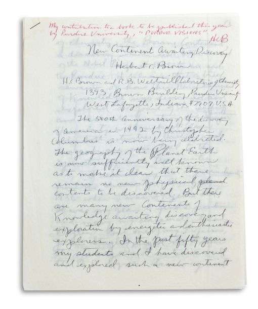 MANUSCRIT autographe signé « Herbert C. Brown », New Continent Awaiting Discovery, [1992] | 9 pages in-4 agrafées | en anglais.
