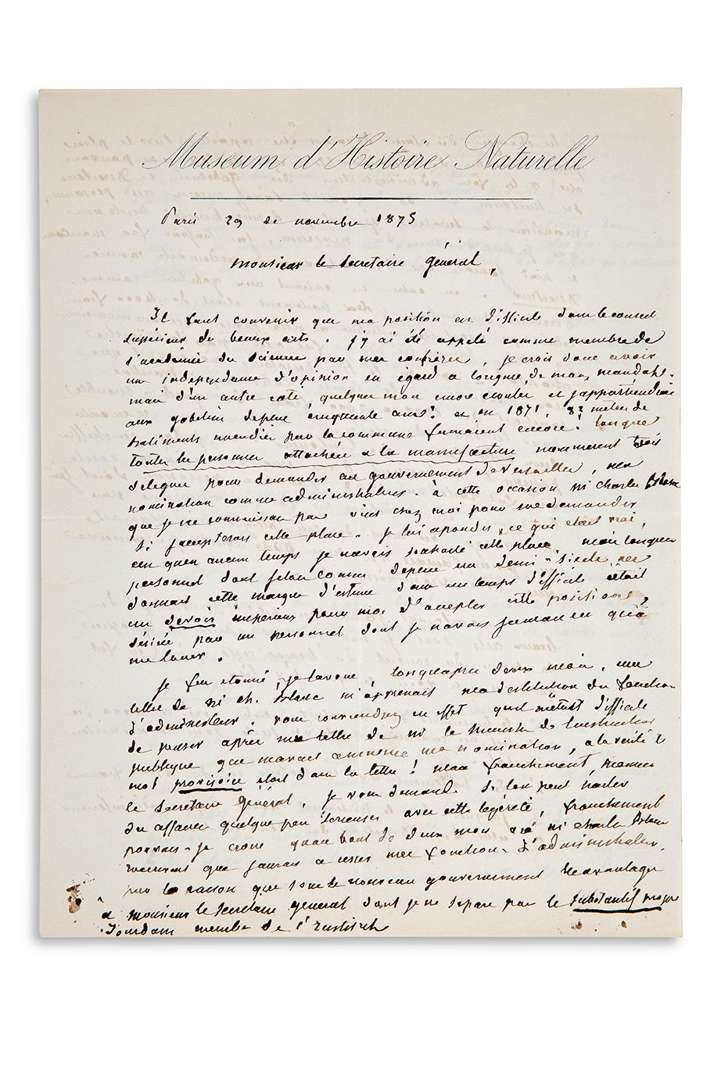 L.A.S., 29 novembre 1875, à Charles JOURDAIN | 4 pages in-4 à en-tête du Muséum d’Histoire naturelle.