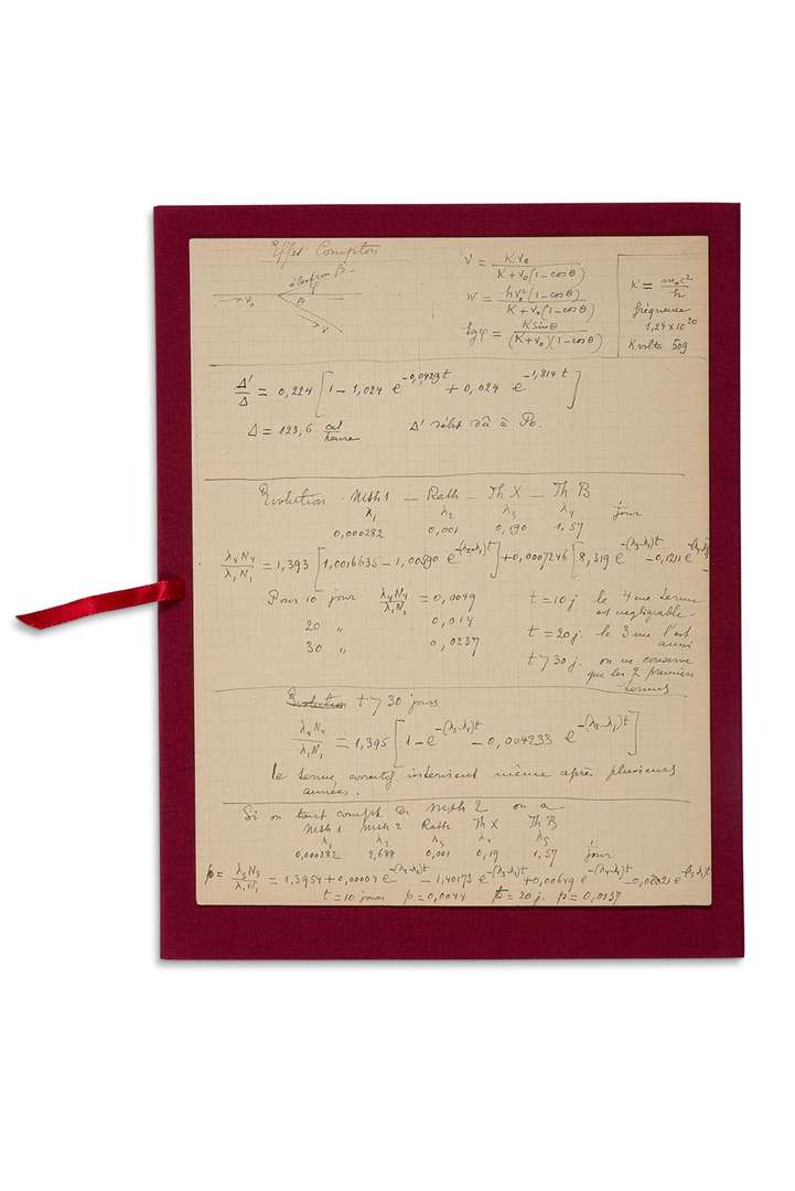 Notes de laboratoires avec calculs mathématiques et mesures. Ce feuillet est accompagné d’une attestation autographe signée de sa fille Irène JOLIOT-CURIE (1897-1956), Paris 16 décembre 1946 (1 p. in-8 à en-tête de l’Institut du Radium) : « Papier écrit par Marie Curie. Feuille ayant servi pour quelques calculs relatifs à la préparation d’une expérience, probablement sur les rayons γ des dérivés du thorium. […] Date probable aux environs de 1925 ». Ces rares calculs de Marie Curie ont donc été effectués au cours de ses recherches sur la radioactivité, notamment, selon sa fille Irène, en même temps qu’une série d’expériences, probablement sur les rayons gamma et les dérivés du thorium. À cette époque, Marie Curie dirige les laboratoires de physique et de chimie de l’Institut du Radium, où elle poursuit ses propres recherches tout en supervisant les travaux des savants sous sa direction. Sa principale préoccupation, comme toujours, était les éléments radioactifs. Les expériences semblent avoir eu lieu sur une période de trente jours (« t>30 j. ») et peuvent avoir été conçuespour mesurer l’évolution du taux de désintégration du thorium X et de certains autres éléments radioactifs. Irène Curie a daté ces notes vers 1925, probablement en fonction du titre «Effet Compton » (l’effet Compton, un moyen de mesurer et d’interpréter le changement de longueur d’onde se produisant lorsque les rayons X sont diffusés, a été découvert par Arthur Compton en 1923), mais aussi probablement par son expérience de travail aux côtés de sa mère. En marge de ses calculs et mesures, Marie Curie a noté : « t=10 j. le 4me terme est négligeable. t=20 j. le 3me l’est aussi. t>30 j. on ne conserve que les 2 premiers termes. […] Le terme correctif intervient même après plusieurs années »…