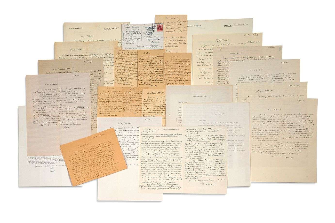 65 L.A.S. et 11 L.S. «A. Einstein », «Albert », « Papa » ou «Vater », 1914-1952, à sa femme et ses fils | environ 90 pages formats divers, dont 24 cartes postales, quelques enveloppes et adresses | plus quelques pièces jointes | en allemand.