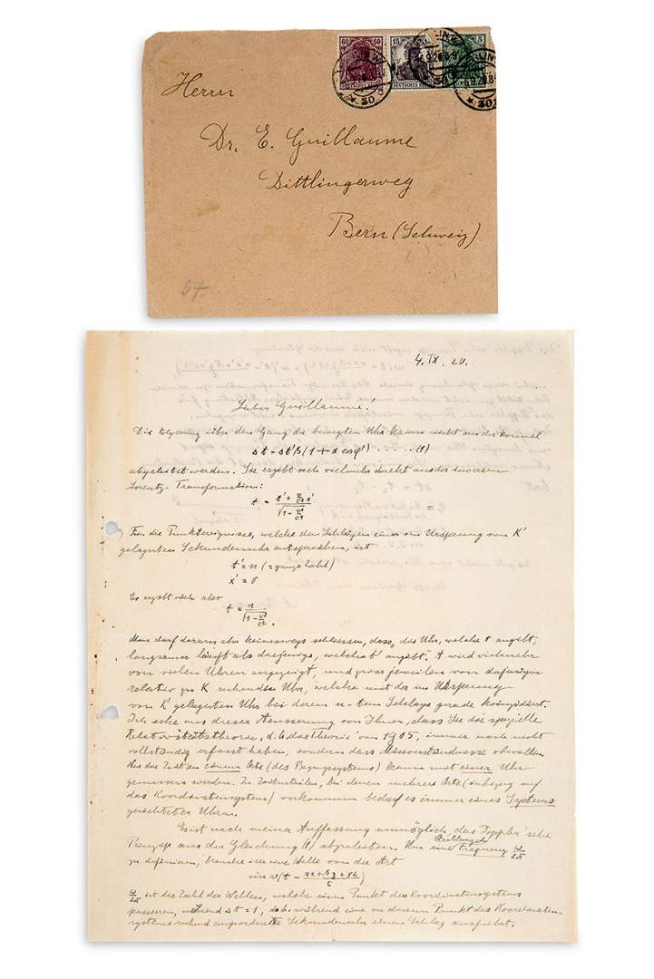 Importante lettre scientifique, avec calculs et équations, sur la mesure du temps et la relativité . [Éditeur d’Henri Poincaré, le physicien Édouard GUILLAUME (1881-1959), cousin du prix Nobel de physique Charles-Édouard Guillaume, fut le collègue d’Einstein à Berne au Bureau de la propriété intellectuelle. Ses conceptions sur un temps universel allaient à l’encontre de la théorie de la relativité d’Einstein, et l’amenèrent à engager une longue et virulente polémique avec celui-ci et Marcel Grossmann, commencée par ses articles dans la Revue de Métaphysique et de Morale sur « La théorie de la relativité et le temps universel » (1918) et « La théorie de la relativité et sa signification » (1920).] Dans cette lettre, Einstein donne de nouvelles explications à Edouard Guillaume. Bien qu’encore décriées par une partie de la communauté scientifique, les théories d’Einstein ont été prouvées en 1919. Arthur Eddington réalise la mesure de la déviation que la lumière d’une étoile subit à proximité du soleil. Ceci est une conséquence directe de la théorie de la gravitation. Mais Guillaume s’entête à prouver le contraire. Il tente de combiner les théories de Christian Andreas Doppler (1803-1853) qui a travaillé sur le décalage réel de la fréquence lumineuse et celles d’Hendrik Antoon Lorentz dont les travaux ont servi de base à la théorie d’Einstein. Les calculs de Doppler étaient erronés et l’utilisation faite par Guillaume des théories de Lorentz ne peut s’appliquer pour la théorie de la relativité.