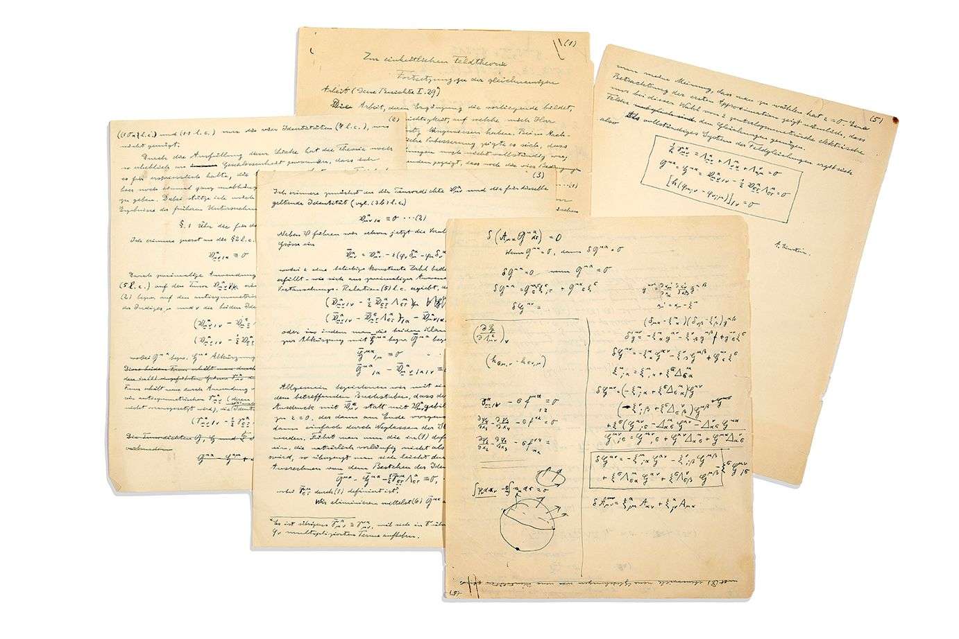 Manuscrit inédit sur la théorie des champs unifiés, avec calculs et équations . Il s’agit d’un brouillon de travail qui, comme son titre l’indique, a été conçu comme une continuation et une amplification de l’article sur les champs unifiés publié dans les Sitzungsberichte der preussischen Akademie der Wissenschaften en 1929. Comme l’explique Einstein au début, ce travail a été motivé par une communication de Lanczos et Müntz, qui avaient sou - ligné que ses équations étaient incomplètes (« beim Nachdenken über die mögliche Verbesserung zeigte es sich, dass das System der Feldgleichungen noch nicht vollständig war »... en réfléchissant à l’amélioration possible, il s’est avéré que le système d’équations de champ n’était pas encore complet). Après ses remarques introductives, Einstein donne un titre de section 1 « Über die für die Theorie wichtigen Identitäten » (Sur les identités importantes pour la théorie), qui continue à la page 5. Cette page porte sa signature et était clairement destinée à la fin de l’article. Cependant, la page 4 (en photocopie) est barrée et la deuxième page 5, également barrée, semble représenter une étape ultérieure du travail sur le matériel précédent. Il semblerait que même lorsqu’il travaillait sur ce manuscrit, Einstein était devenu insatisfait de son approche et avait commencé à chercher des alternatives. Le présent travail a peut-être été écarté au profit d’un autre article, intitulé Einheitliche Feldtheorie und Hamiltonsches Prinzip, soumis à la Preussische Akademie der Wissenschaften en mars 1929 (et publié alors dans les Sitzungsberichte, p. 156-159) où Einstein a reconnu les critiques formulées par Lanczos et Müntz. Calculs au dos de la p. 1 et de la p. 5 | la p. 4 en photocopie.